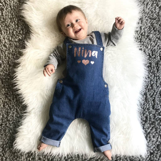Personalised Name With Hearts Baby Denim Dungarees