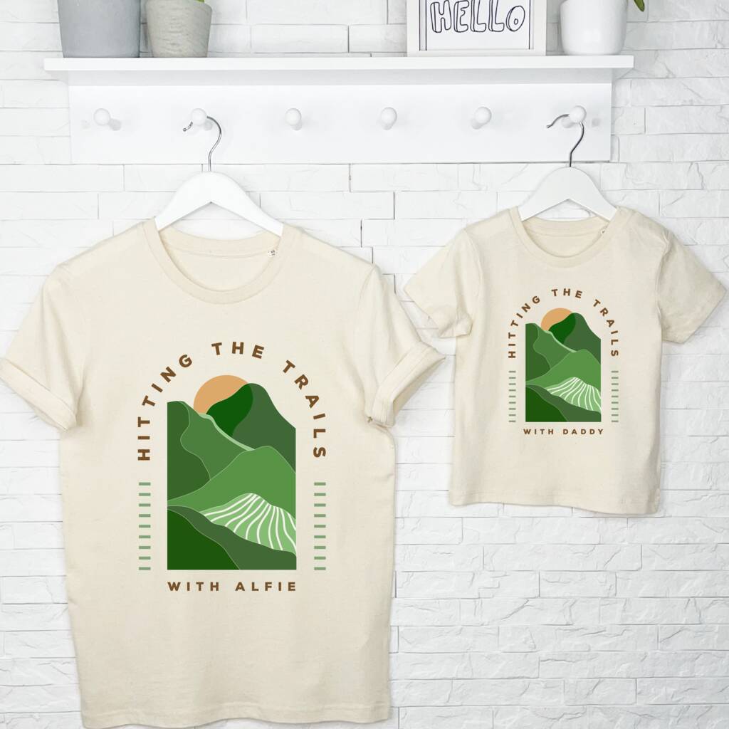 Hiking or Trail running is so popular and this matching T Shirt Set makes a great gift for a Dad for Father's Day or Dad's Birthday. A modern and cool design saying 'Hitting the Trail', extra special as this is personalised with names as well. Available from 0-6 months so this would also make a great new Baby Gift for a New Dad.