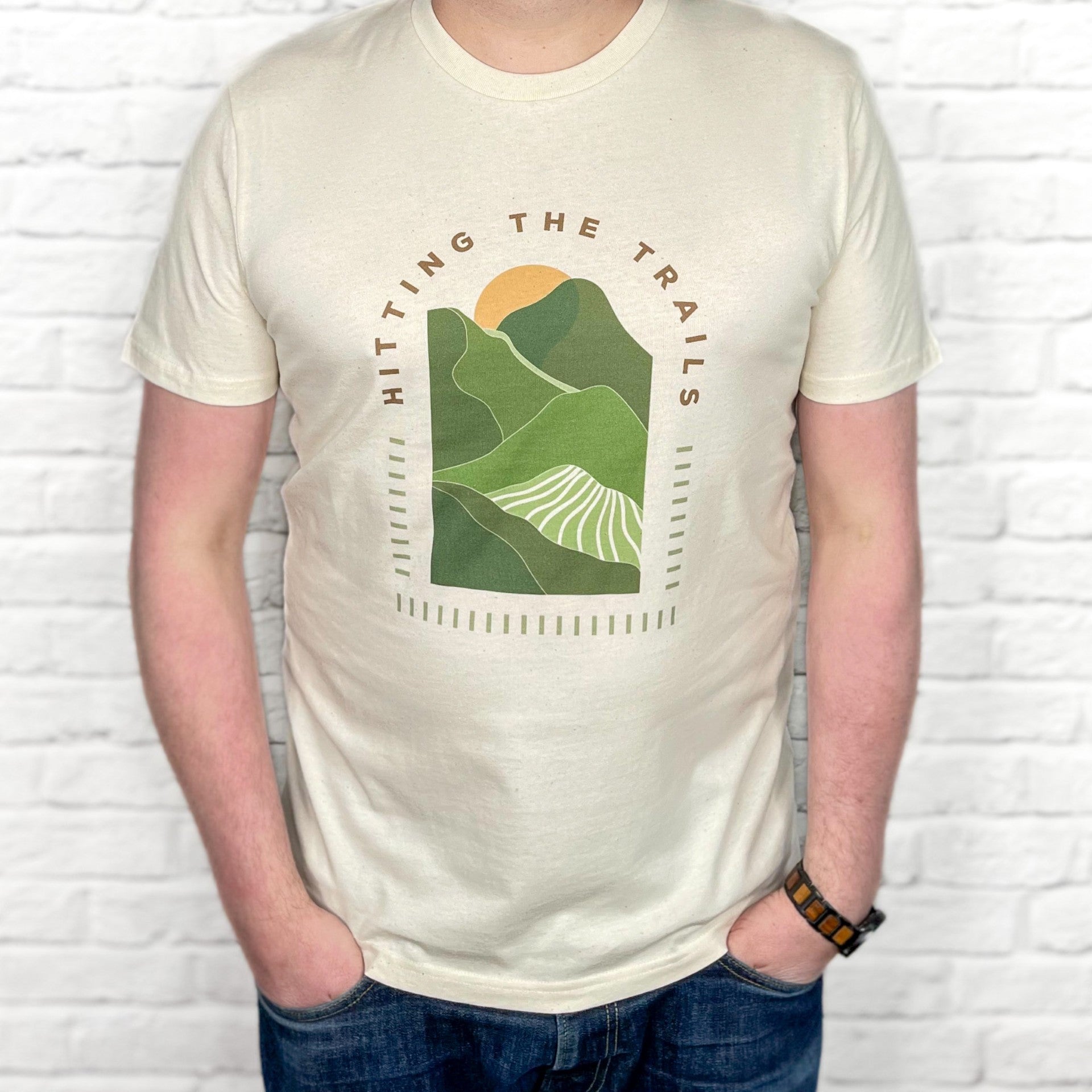 A natural mountain design printed on an Organic Natura lT Shirt. Any trail runner will love this T Shirt to express their love of trail running in an understated way. A great gift for a Dad, Boyfriend or Husband who embrace trail running. A great Father's Day gift for a Dad who's hobby is to go trail running.