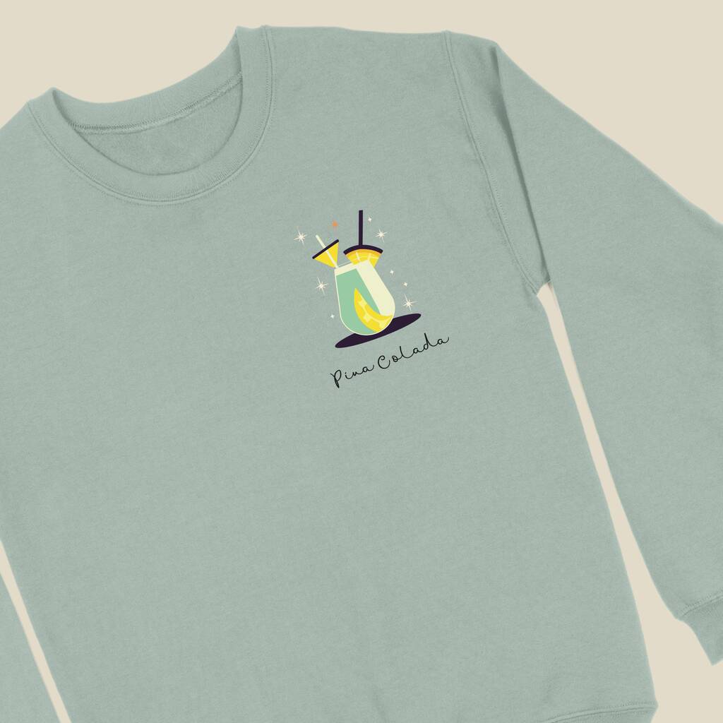 Our cute Pina Colada design is a modern pocket print, printed on a modern sage green sweatshirt. A perfect Sweatshirt T Shirt for a bottomless brunch or a gift for a friend who's favourite cocktail is an Pina Colada.