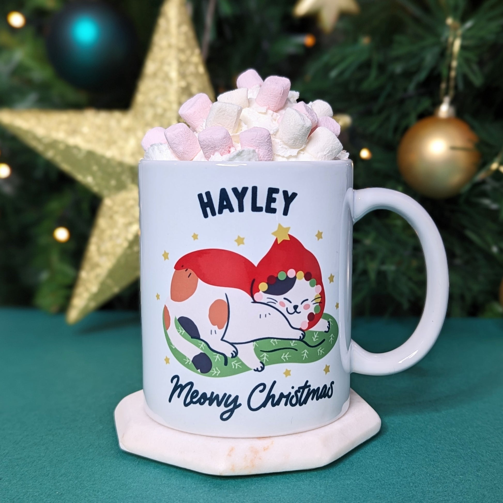 Enjoy those Christmas Hot Chocolates this Christmas with this personalised colourful and bright Cat Christmas Mug.