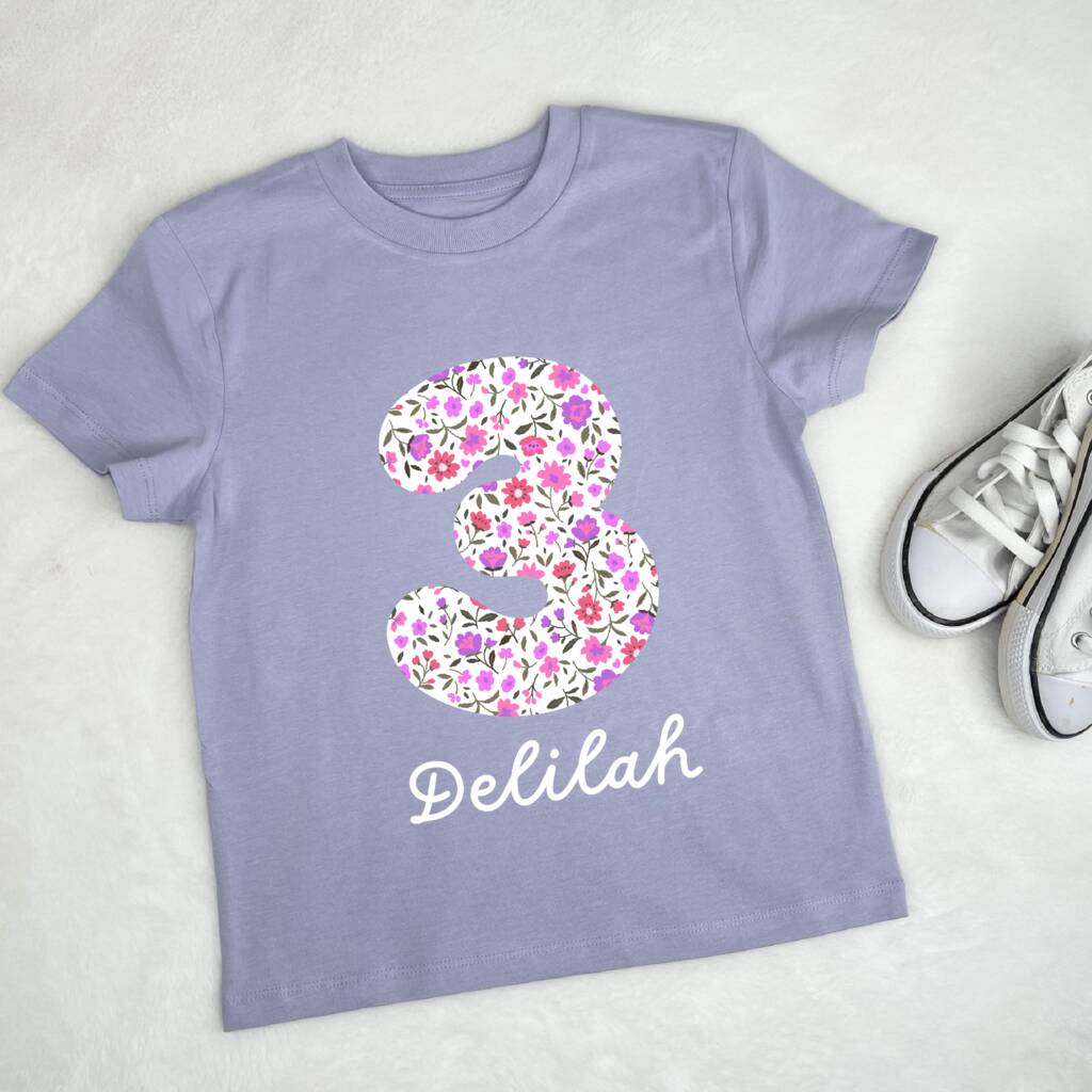 A modern floral design printed on an organic Lavender T Shirt. These Birthday T Shirts are lovely to wear on a little girls Birthday or for a Girl's Birthday party. Personalised with their age, and made extra special with their name on the T Shirt too. Not just for Birthday's they will love to wear these after their Birthdays too.