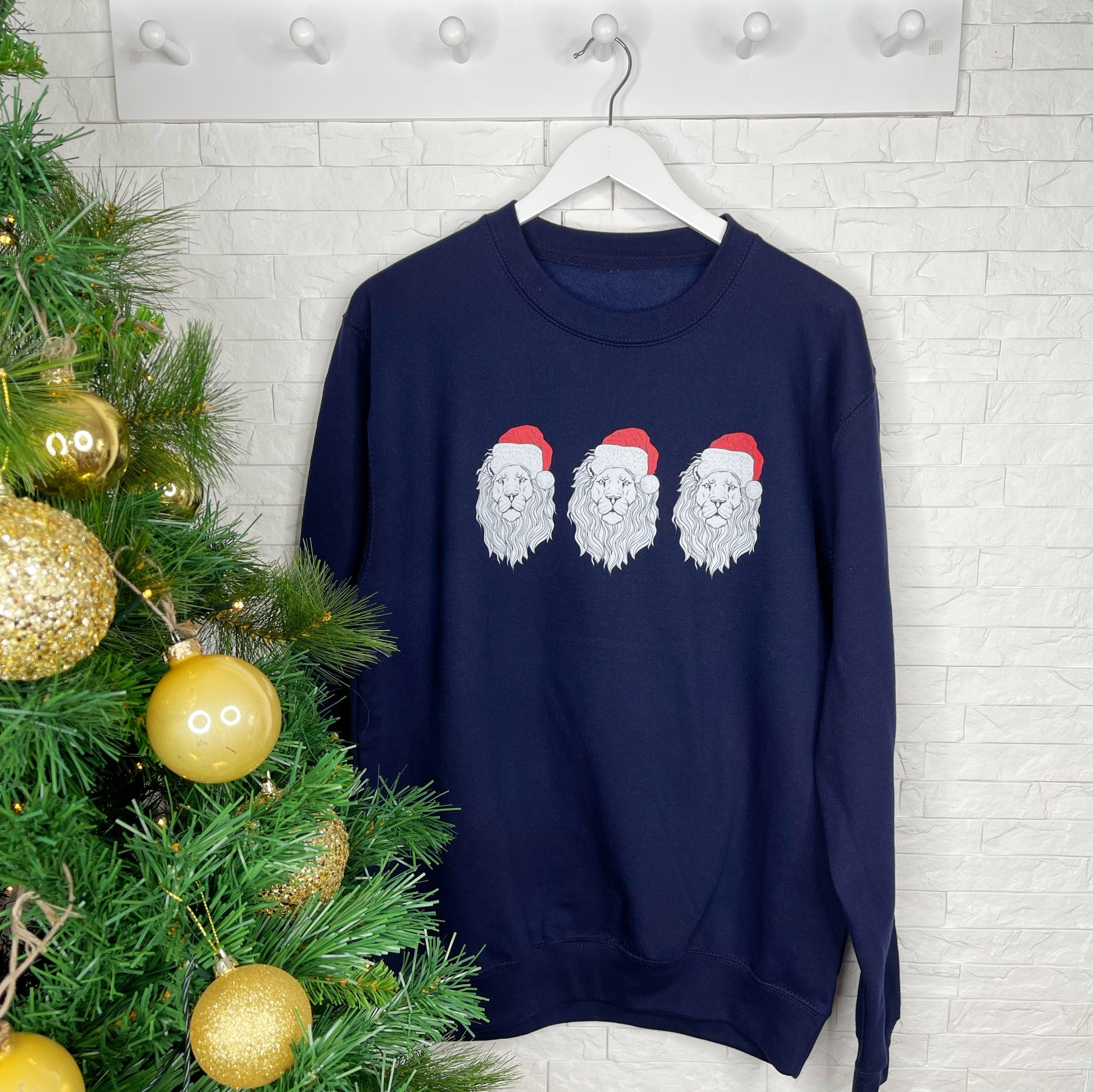 Our Three Lions Christmas Jumper is available in Navy or White.