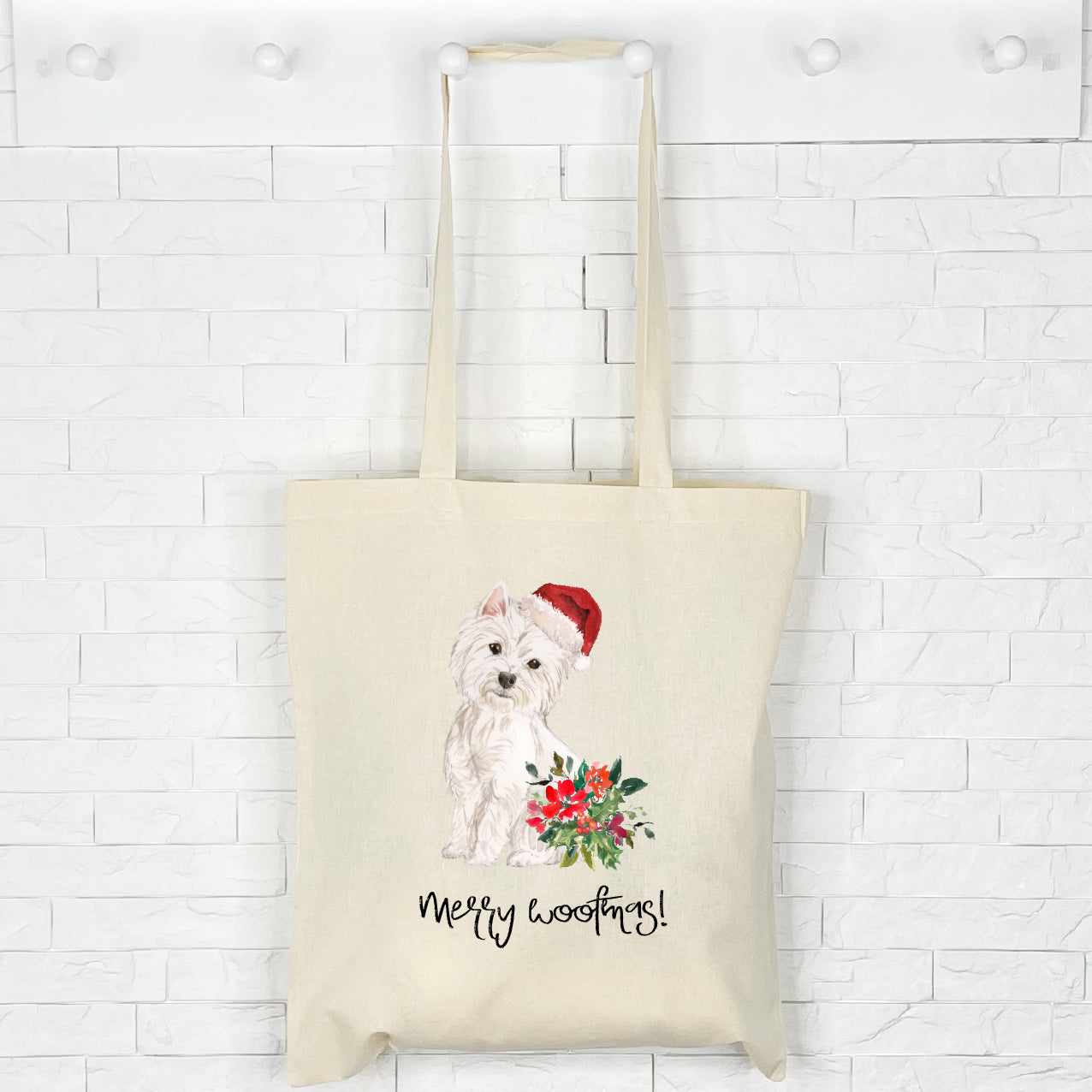 Merry Woofmas! Our Westie Dog Christmas Tote Bag is the perfect Christmas accessory or christmas gift for someone who is the owner of a Westie.